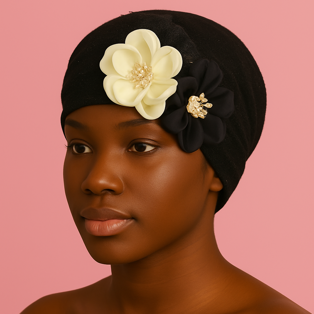 Step into timeless elegance with the Blossom Grace Turban—a stunning blend of comfort, style, and floral artistry. Crafted from a soft, stretchable black fabric, this turban offers a snug yet breathable fit that’s ideal for everyday wear or special occasions.