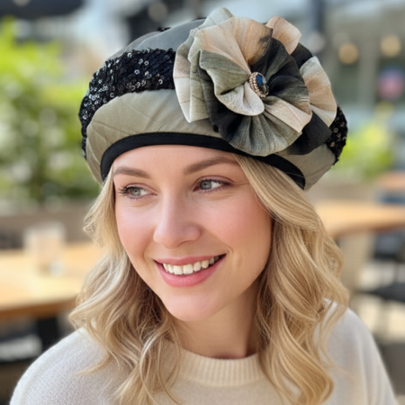 Elegant and eye-catching, this shimmering cap features luxurious sequins and floral lace — perfect for making a bold statement with grace.