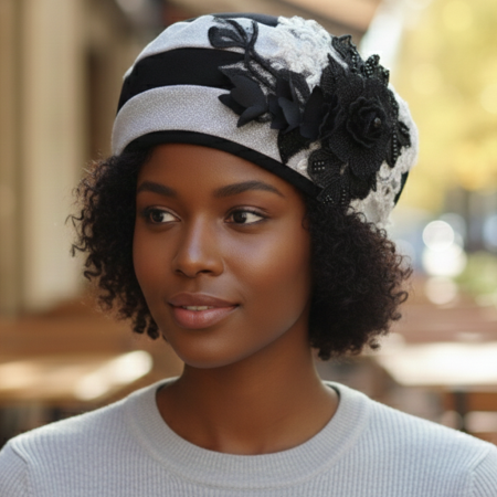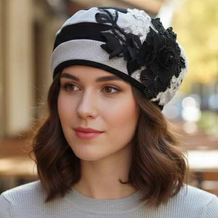 Make your entrance memorable. Let the Midnight Bloom Lace Beret crown your style with elegance and individuality.