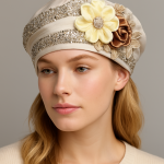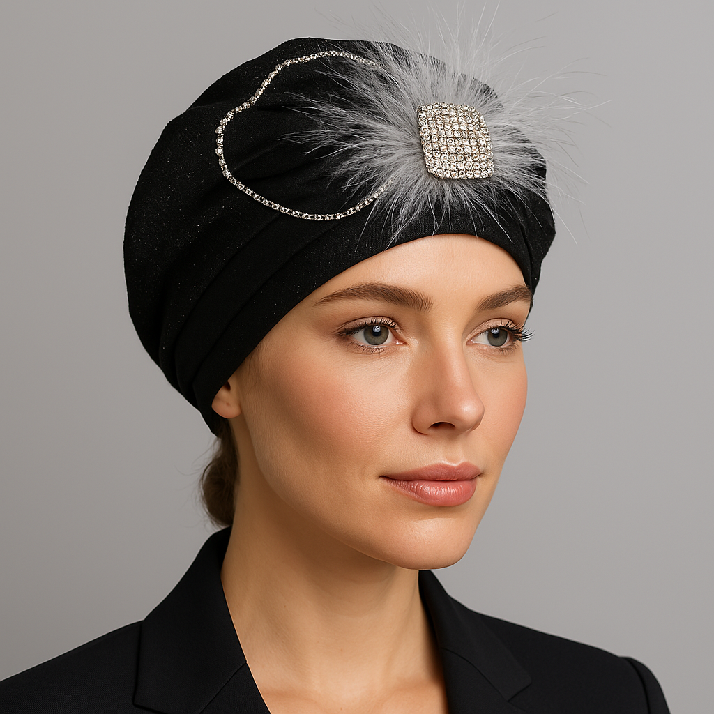 A luxe satin and sequin beret crowned with elegant floral embellishments and radiant sparkle—where timeless grace meets modern glam.