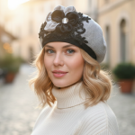 Step into timeless elegance with the Parisian Bloom Beret, a luxuriously soft knit adorned with exquisite black lace appliqué and a striking satin floral rosette centered by a dazzling crystal. This accessory flawlessly blends vintage romance with modern chic, offering a captivating finishing touch for any cold-weather ensemble. Designed for the discerning individual, it ensures both sophisticated style and comforting warmth—the ultimate statement piece for your winter wardrobe, inviting compliments wherever you go.