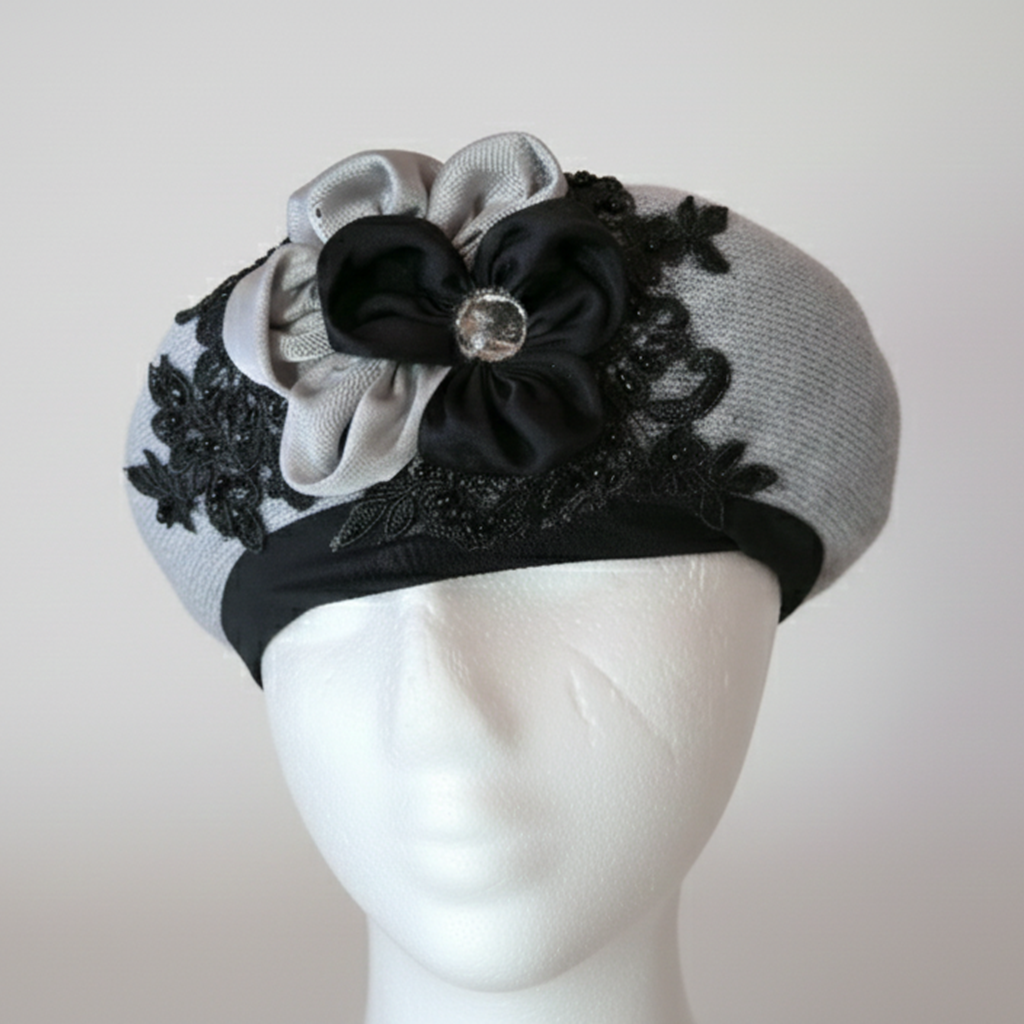 Elevate your look with the Parisian Bloom Beret, a refined accessory featuring soft grey knit, intricate black lace, and a delicate satin rosette. This elegant hat provides a perfect blend of warmth and high-fashion style for any cold-weather outing.