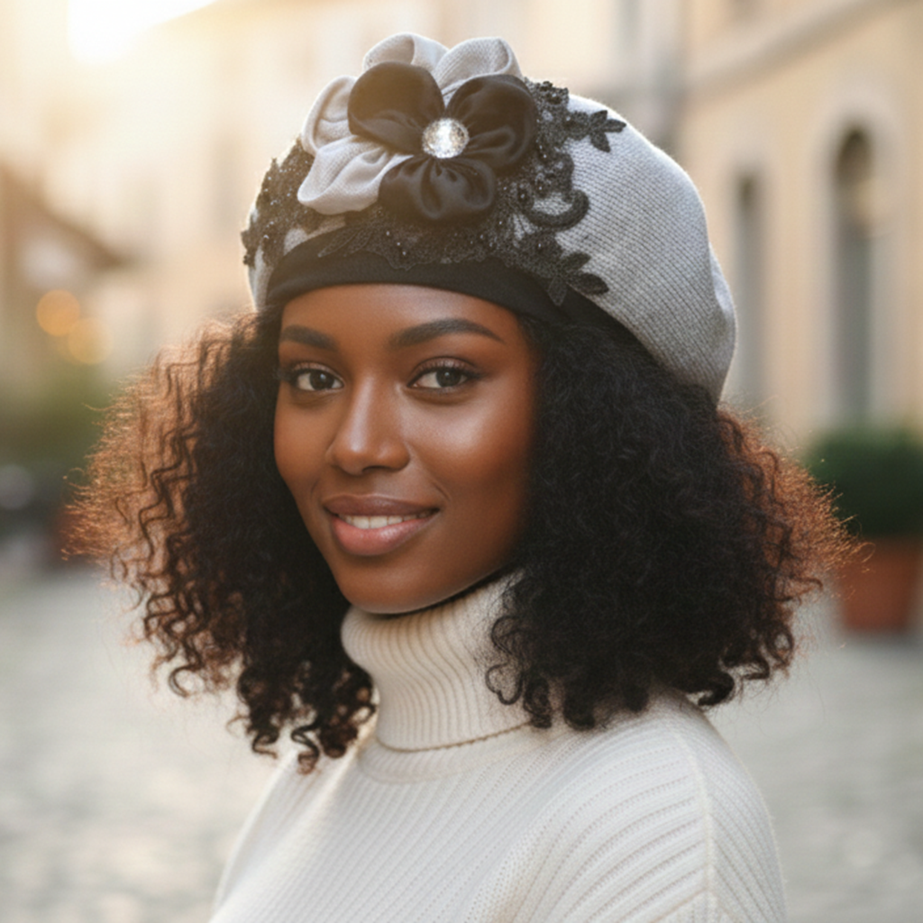 Step into timeless elegance with the Parisian Bloom Beret, a luxuriously soft knit adorned with exquisite black lace appliqué and a striking satin floral rosette centered by a dazzling crystal. This accessory flawlessly blends vintage romance with modern chic, offering a captivating finishing touch for any cold-weather ensemble. Designed for the discerning individual, it ensures both sophisticated style and comforting warmth—the ultimate statement piece for your winter wardrobe, inviting compliments wherever you go.