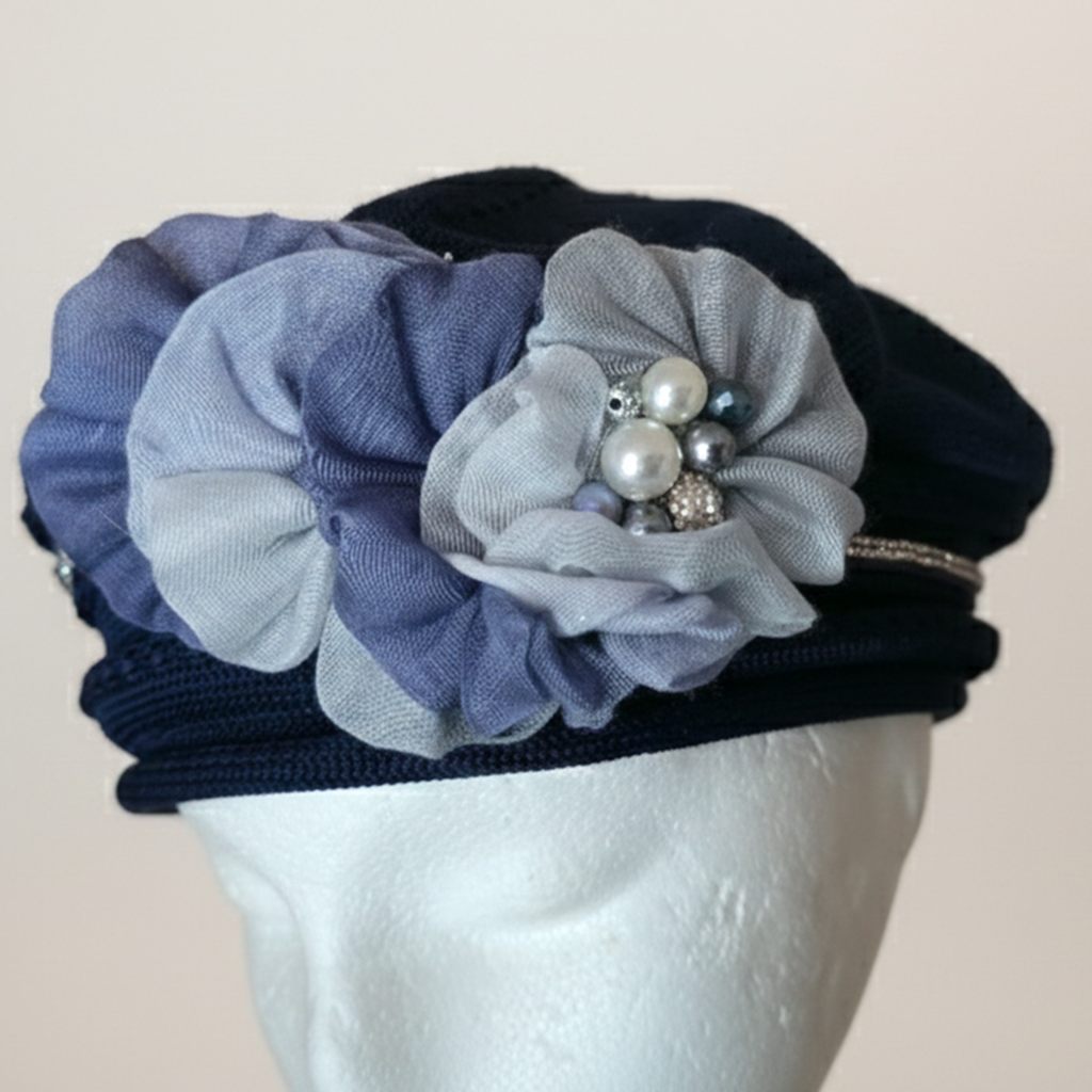 Elevate your look with this elegant navy knit cap, featuring a stunning floral appliqué adorned with luminous pearls and chic rhinestones. Experience the perfect blend of luxurious style and gentle, comfortable coverage for any occasion.