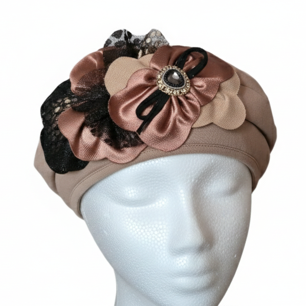 Introducing The Petal Turbanette, a sophisticated headpiece that blends the comfort of a cap with timeless elegance. Crafted in a rich, warm taupe, this unique turban-style accessory features a stunning three-dimensional cluster of satin and lace petals in coordinating mocha and black. Crowned with a sparkling central jewel and delicate bow accents, it’s the perfect statement piece for weddings, garden parties, or adding instant glamour to your everyday look, offering chic coverage and undeniable style.