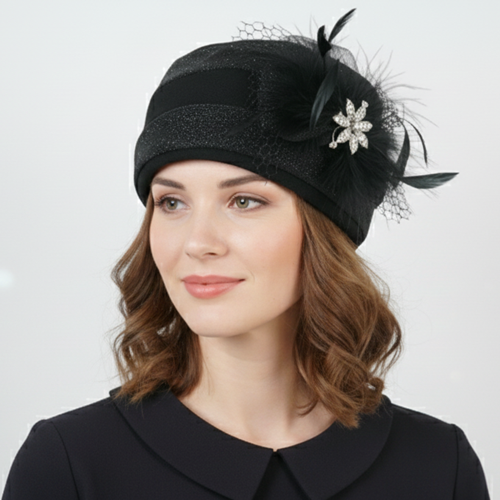 The Velvet Vesper is an elegant black cloche cap adorned with a dazzling rhinestone flower and delicate feathers. Perfect for adding a touch of sophisticated glamour to any formal event or evening out.