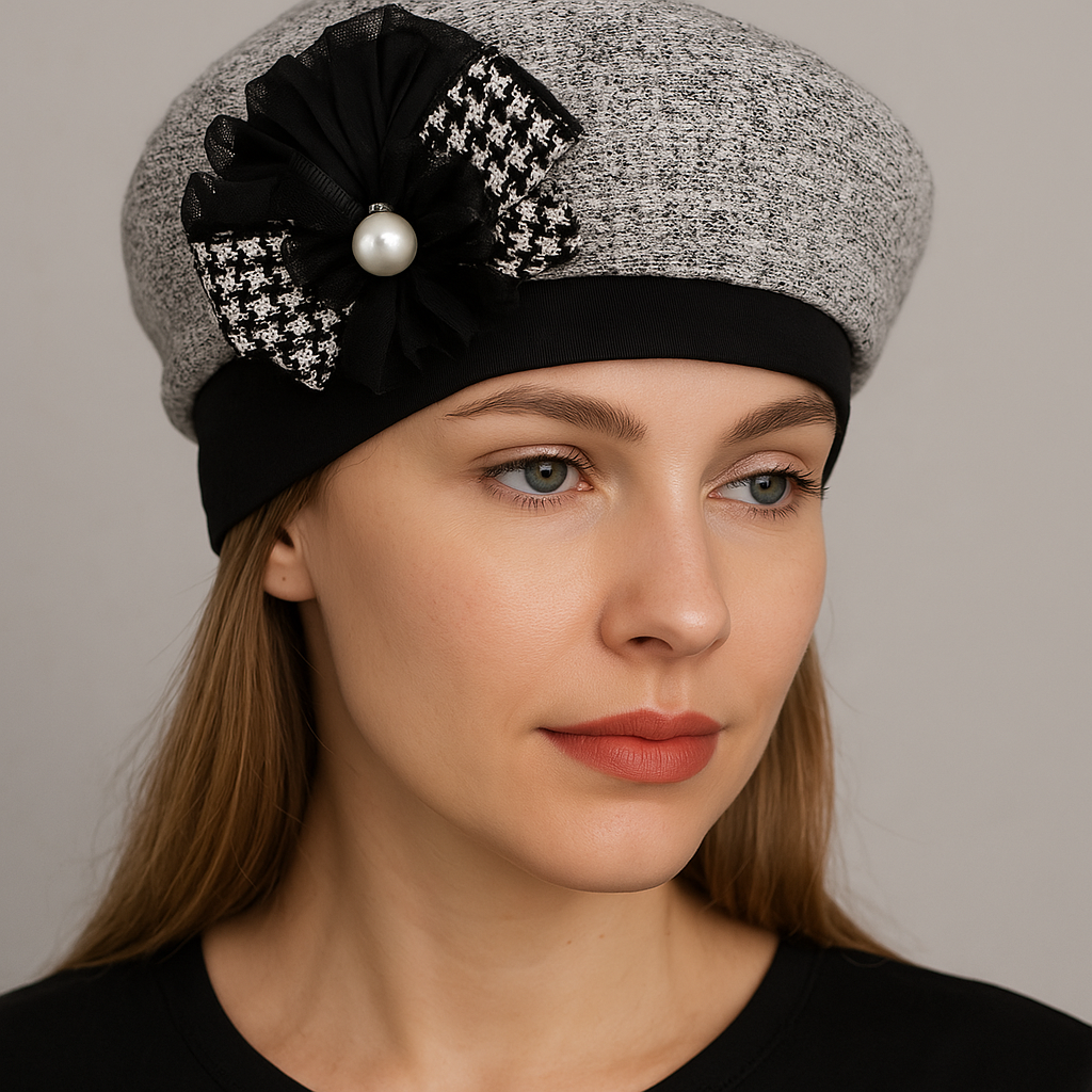 A classic houndstooth beret with a modern twist—featuring a soft tweed texture, black tulle bow, and elegant pearl accent for timeless sophistication.